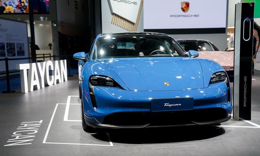 A Porsche Taycan electric vehicle is displayed at the 4th China International Import Expo (CIIE) in Shanghai, east China, Nov. 5, 2021. (Xinhua/Ding Ting)