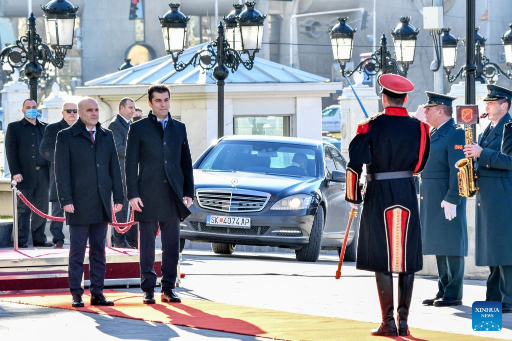North Macedonia's Prime Minister Dimitar Kovachevski (L) welcomes Bulgarian Prime Minister Kiril Petkov in Skopje, North Macedonia, Jan. 18, 2022. (Photo by Tomislav Georgiev/Xinhua)