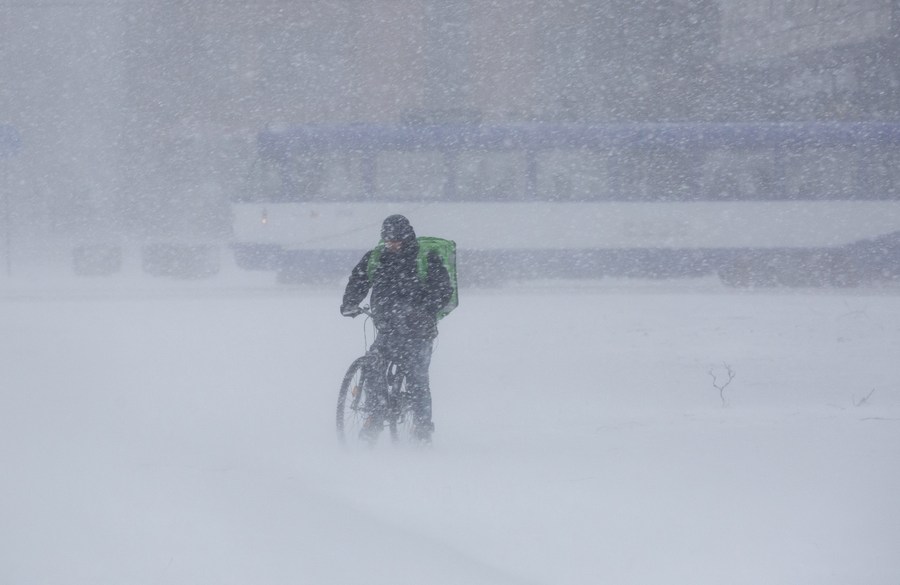 A man rides a bike in the snow in Riga, Latvia, on Jan. 17, 2022. (Photo by Edijs Palens/Xinhua)