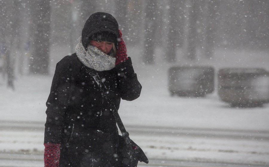 A woman walks in the snow in Riga, Latvia, on Jan. 17, 2022. (Photo by Edijs Palens/Xinhua)
