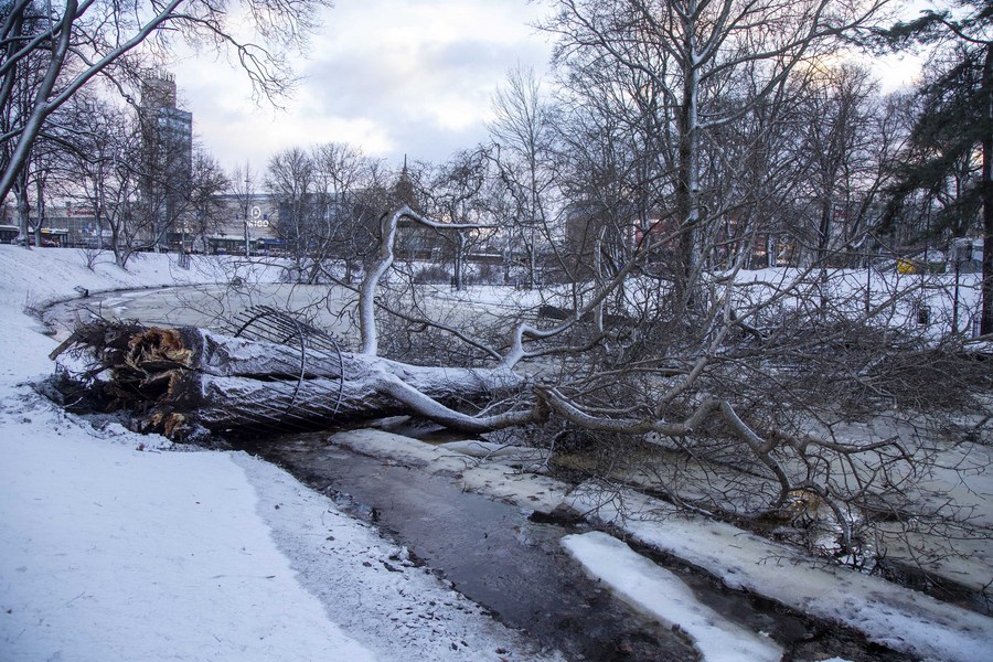 A tree falls down to the ground after a storm in Riga, Latvia, Jan. 17, 2022. (Photo by Edijs Palens/Xinhua)