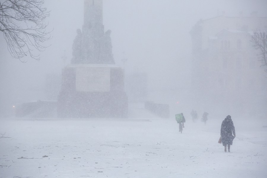 People walk in the snow in Riga, Latvia, on Jan. 17, 2022. (Photo by Edijs Palens/Xinhua)