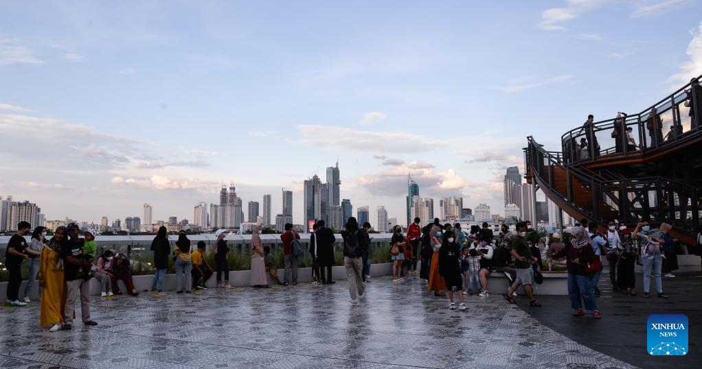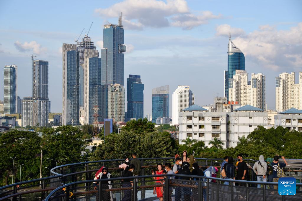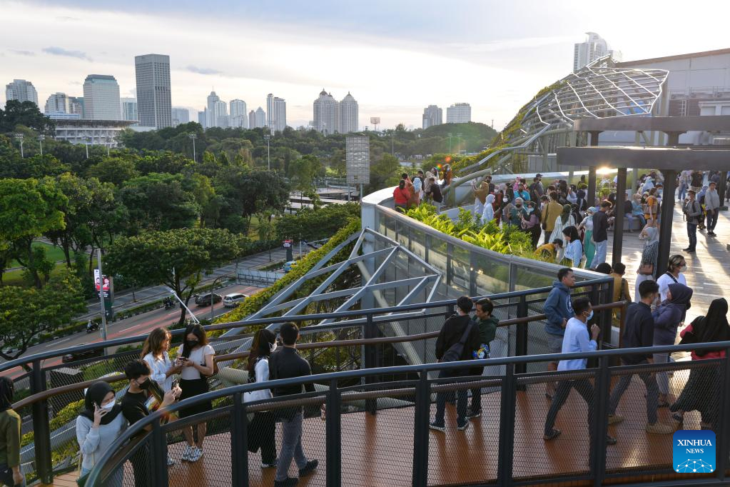 People enjoy city view near the skywalk of Senayan Park in Jakarta, Indonesia, Jan. 23, 2022. Indonesian lawmakers on Jan. 18 passed a law on the relocation of the nation's capital to the island of Kalimantan, which the country shares borders with Malaysia and Brunei, from the most populated island of Java. Nusantara, which the new capital is called, will be built in two districts in East Kalimantan -- Penajam Paser Utara and Kutai Kartanegara. It is set to occupy about 256,000 hectares of land. Nusantara will serve as the center of government, while Jakarta would remain the business and economic center of Indonesia, Southeast Asia's biggest economy. (Xinhua/Xu Qin)