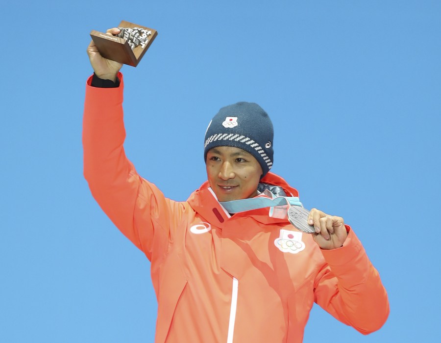 Silver medalist Akito Watabe from Japan poses for photos during the medal ceremony of individual gundersen NH/10KM event of nordic combined at Pyeongchang 2018 Winter Olympic Games at Medal Plaza, PyeongChang, South Korea, Feb. 15, 2018. (Xinhua/Wu Zhuang)