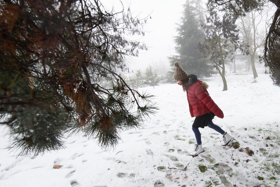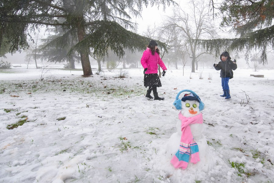Israelis enjoy snow at an open field after a snowstorm in the Israel-occupied Golan Heights, on Jan.19, 2022. (Ayal Margolin/JINI via Xinhua)■