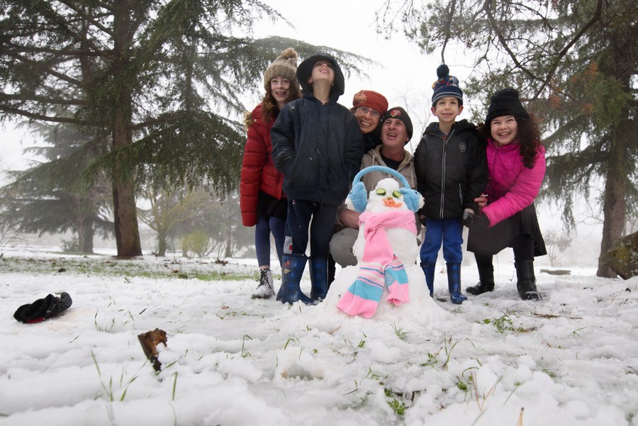 Israelis enjoy snow at an open field after a snowstorm in the Israel-occupied Golan Heights, on Jan.19, 2022. (Ayal Margolin/JINI via Xinhua)