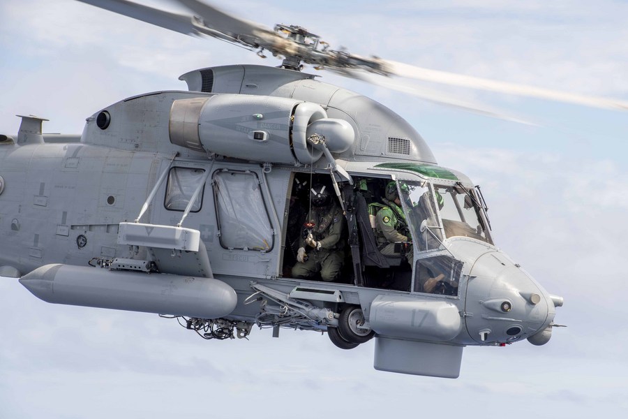 A helicopter is doing a training flight during New Zealand Navy vessel HMNZS Wellington's transit to Tonga on Jan. 19, 2022. (New Zealand Ministry of Defense/Handout via Xinhua)