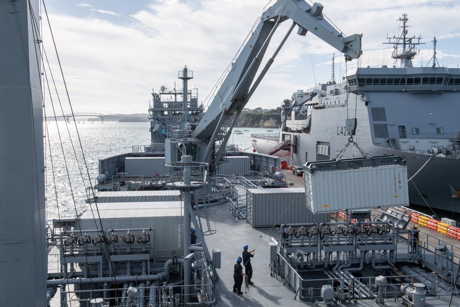 Military staff work onboard New Zealand Navy vessel HMNZS Aotearoa on Jan. 18, 2022. (New Zealand Ministry of Defense/Handout via Xinhua)