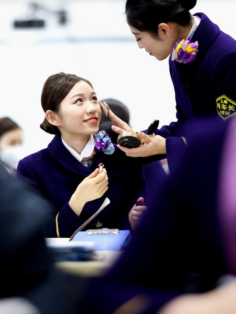 Zhou Tao (L), a crew member of railway Shanghai section puts on make-ups with the help of her colleague in Shanghai, east China, Jan. 19, 2022. (Xinhua/Chen Fei)