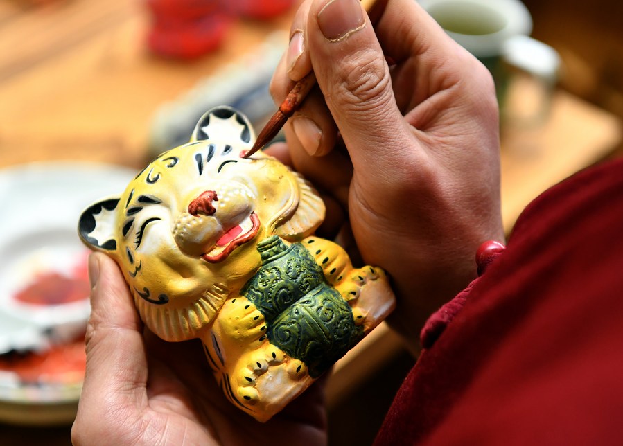 An artist makes a clay figurine of tiger as the Year of Tiger approaches in Botou City, north China's Hebei Province, Jan. 19, 2022. (Xinhua/Luo Xuefeng)