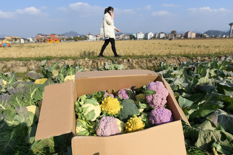 Photo taken on Jan. 19, 2022 shows colorful broccoli in the field in Fengqiao Town of Zhuji City, east China's Zhejiang Province. (Xinhua/Weng Xinyang)