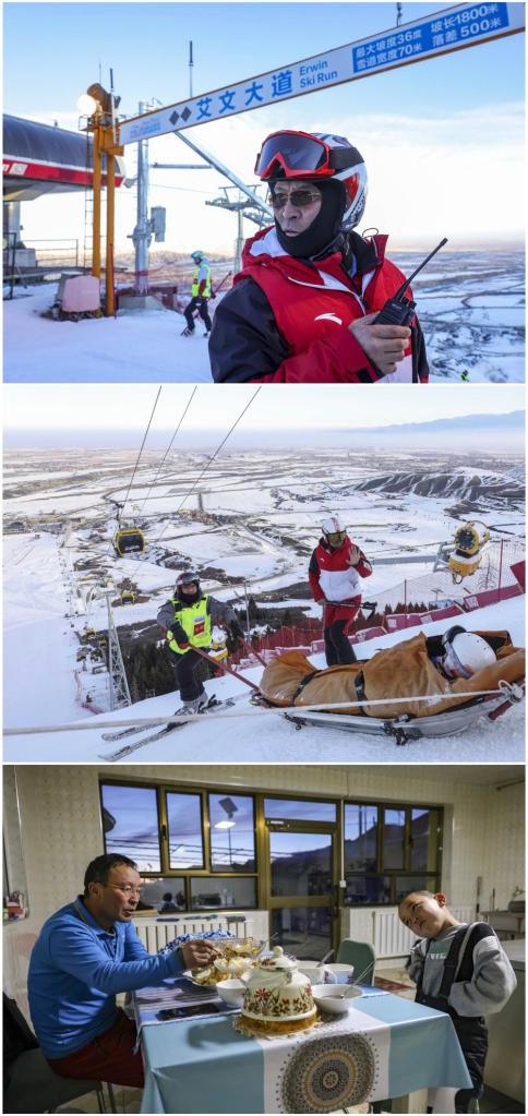 Combo photo shows Talhat Satayr patrols at Silkroad Resort on Jan. 10, 2022 (top), Talhat Satayr talks to an "injured skier" during a drill at Silkroad Resort on Jan. 11, 2022 (middle), and Talhat Satayr (L) has breakfast with his son at home on Jan. 11, 2022 in Urumqi, northwest China's Xinjiang Uygur Autonomous Region. Talhat Satayr, 45, is the captain of the ski patrol team, which provides rescue services for tourists in need, at Silkroad Resort in Urumqi of Xinjiang. (Xinhua/Hu Huhu)