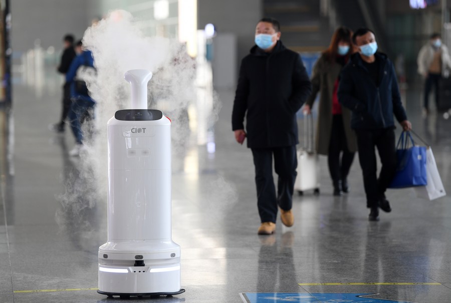 Air environment automatic sterilizer robot Xiao Chuang sprays disinfectant at Hefei South Railway Station in Hefei, east China's Anhui Province, Jan. 18, 2022. Air environment automatic sterilizer robot Xiao Chuang, intelligent temperature measuring robot Da Bai and ground cleaning and disinfecting robot Xiao De have been in service for COVID-19 prevention and control during the annual Spring Festival travel rush in Hefei. (Xinhua/Zhou Mu)