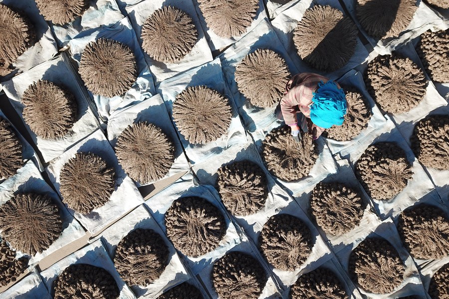 Aerial photo taken on Jan. 19, 2022 shows a worker spreading Danggui, or angelica at a Chinese medicine processing factory in Minxian County, northwest China's Gansu Province. (Xinhua/Fan Peishen)