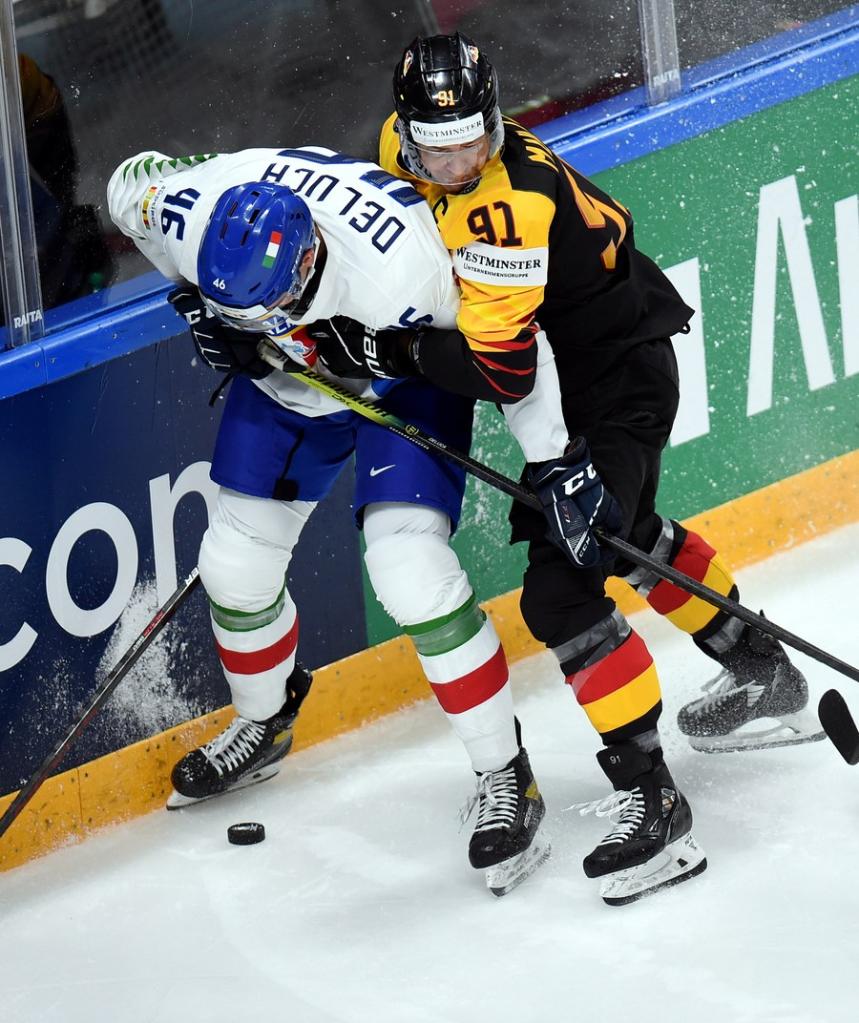 Germany's defenseman Moritz Muller (R) vies with Italy's forward Ivan Deluca during the Group B match between Germany and Italy at the 2021 IIHF Ice Hockey World Championship in Riga, Latvia, May 21, 2021. (Photo by Edijs Palens/Xinhua)