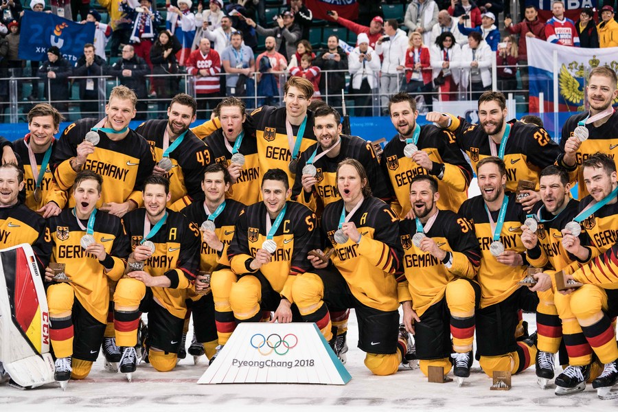 Silver medalists Germany's players celebrate during the medal ceremony of men's ice hockey event at Gangneung Hockey Center, in Gangneung, South Korea, Feb. 25, 2018. (Xinhua/Wu Zhuang)