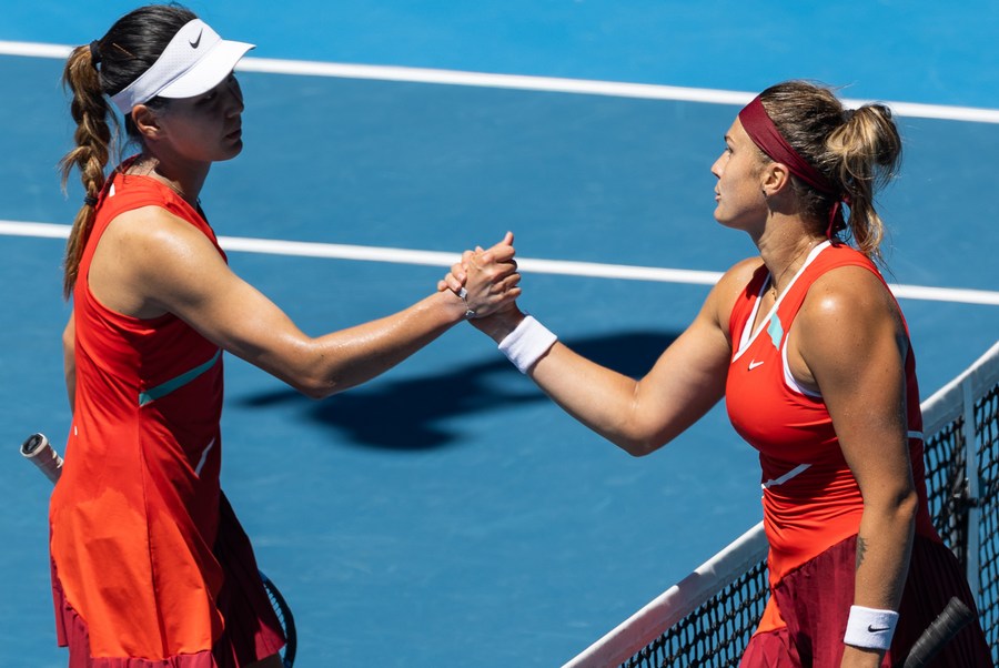 Wang Xinyu (L) of China greets Aryna Sabalenka of Belarus after their women's singles second round match at Australian Open in Melbourne Park, in Melbourne, Australia, on Jan. 20, 2022. (Photo by Hu Jingchen/Xinhua)
