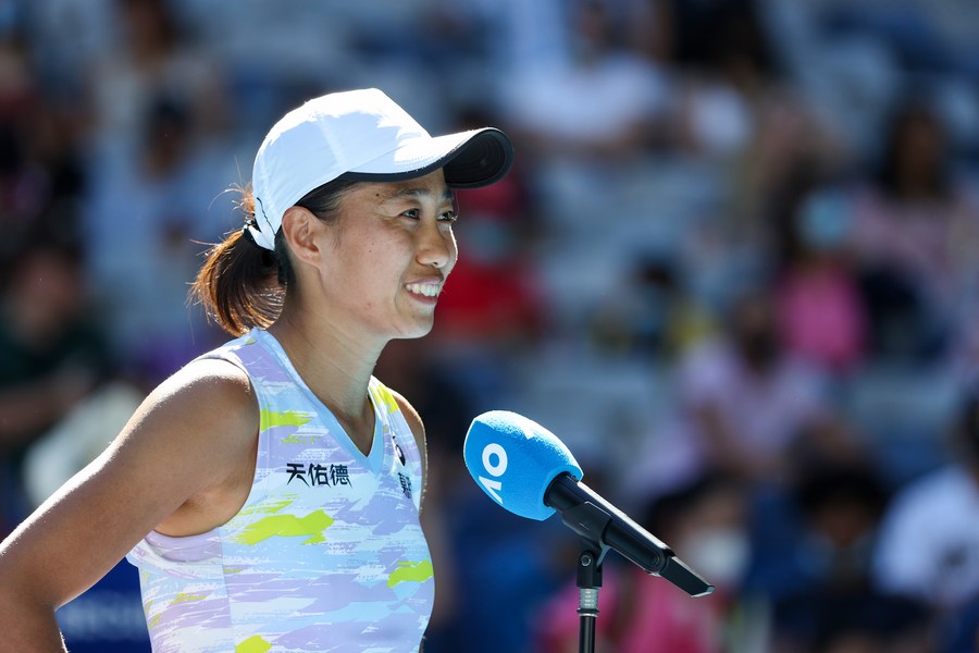 Zhang Shuai of China is interviewed after the women's singles second round match against Elena Rybakina of Kazakhstan at Australian Open in Melbourne Park, in Melbourne, Australia, on Jan. 20, 2022. (Xinhua/Bai Xuefei)