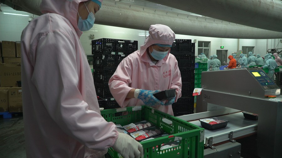 Workers seal chicken and half-prepared hotpot packages in Hainan (Tanniu) Wenchang Chicken Co., Ltd. in south China's Hainan Province, Dec. 30, 2021. (Xinhua/Li Duojiang)