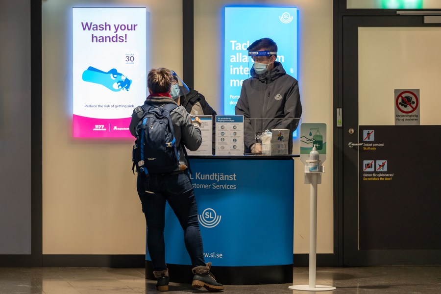 A staff member wearing a face mask and a shield answers a passenger's questions at a subway station in Stockholm, Sweden, on Feb. 10, 2021. (Photo by Wei Xuechao/Xinhua)■