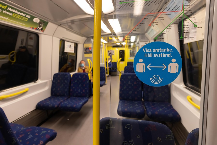 Photo taken on May 6, 2021 shows a sign asking people to keep social distance in a metro compartment in Stockholm, capital of Sweden.(Photo by Wei Xuechao/Xinhua)