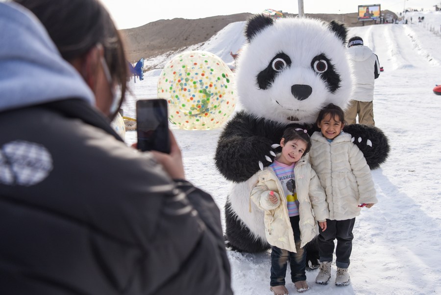 Tourists pose for a photo at Oynak ski resort in Moyu County, northwest China's Xinjiang Uygur Autonomous Region, Jan. 9, 2022. (Xinhua/Ding Lei)