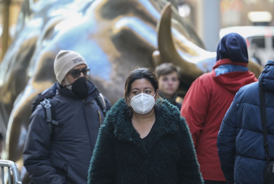 A man wearing a face mask walks on a street in Manhattan of New York, the United States, Jan. 19, 2022. (Xinhua/Wang Ying)