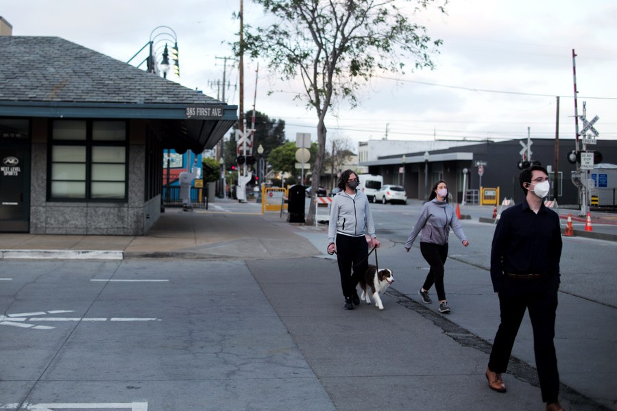 File photo taken on April 21, 2021 shows a man wearing a N95 face mask on a street in San Mateo, California, the United States. (Xinhua/Wu Xiaoling)