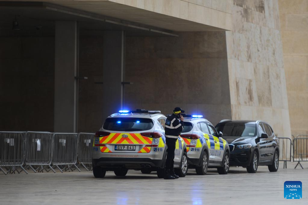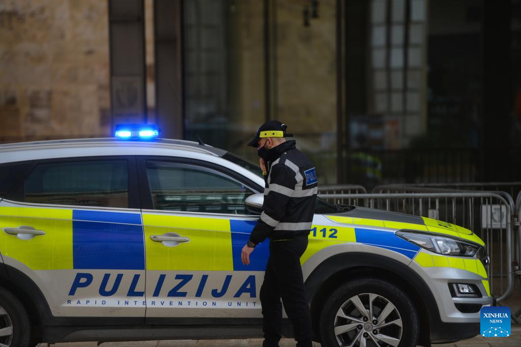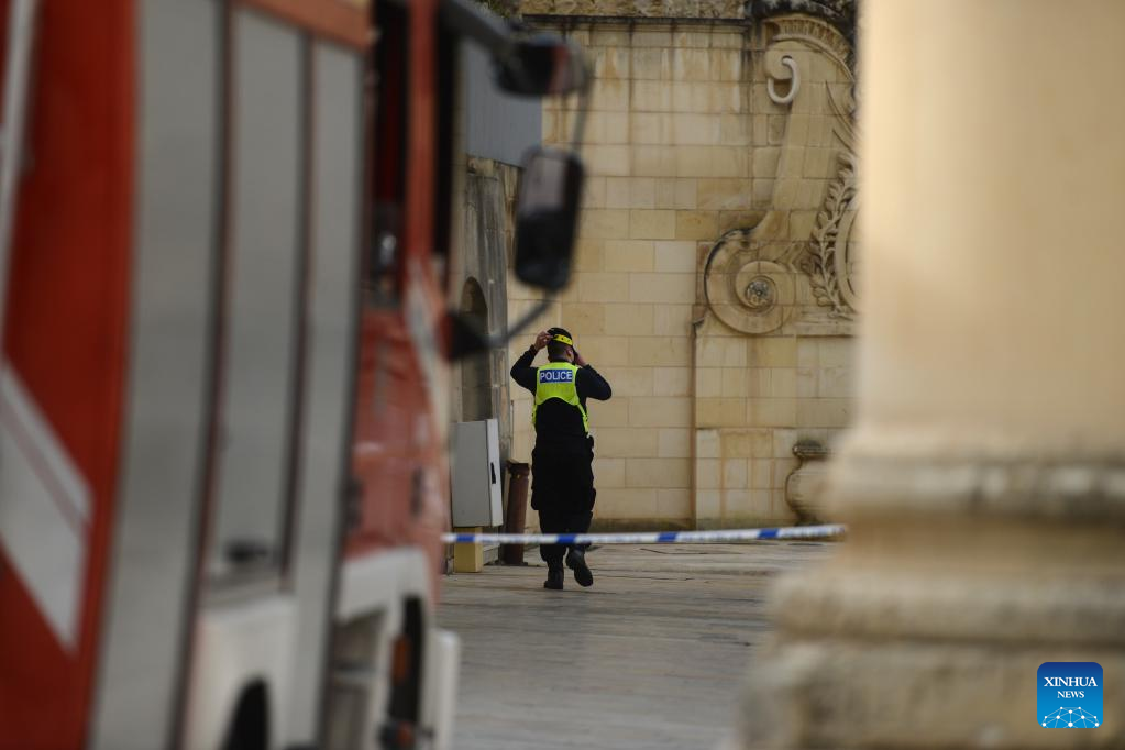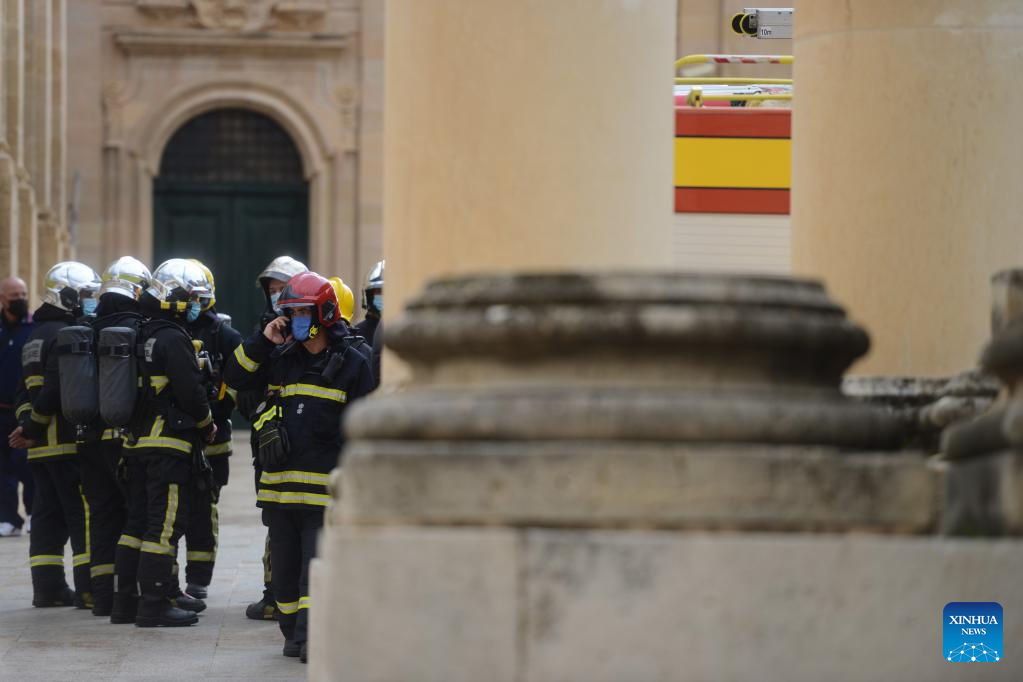 Photo taken on Jan. 20, 2022 shows a scene of a hostage rescue drill in Valletta, Malta. About 100 people of emergency services on Thursday participated in the hostage rescue drill, organized by the Maltese government, at Malta's Parliament House in Valletta. (Photo by Jonathan Borg/Xinhua)