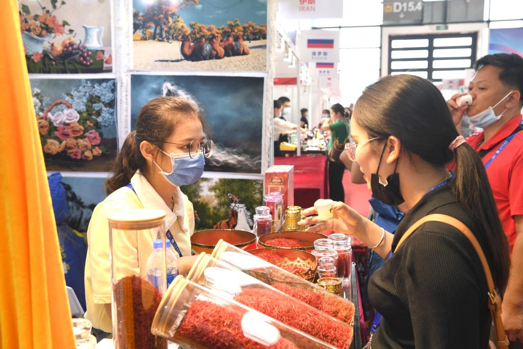 A visitor tries products from Iran during the 18th China-ASEAN Expo in Nanning, capital of south China's Guangxi Zhuang Autonomous Region, Sept. 12, 2021. (Xinhua/Zhou Hua)