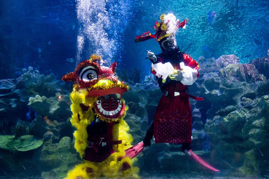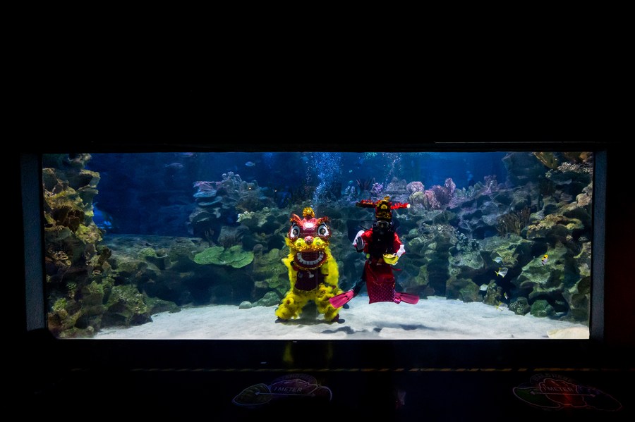 Divers dressed as a lion and a Fortune God stage an underwater performance in celebration of the Chinese Lunar New Year during a media preview at the Aquaria KLCC aquarium in Kuala Lumpur, Malaysia, Jan. 21, 2022. (Xinhua/Zhu Wei)