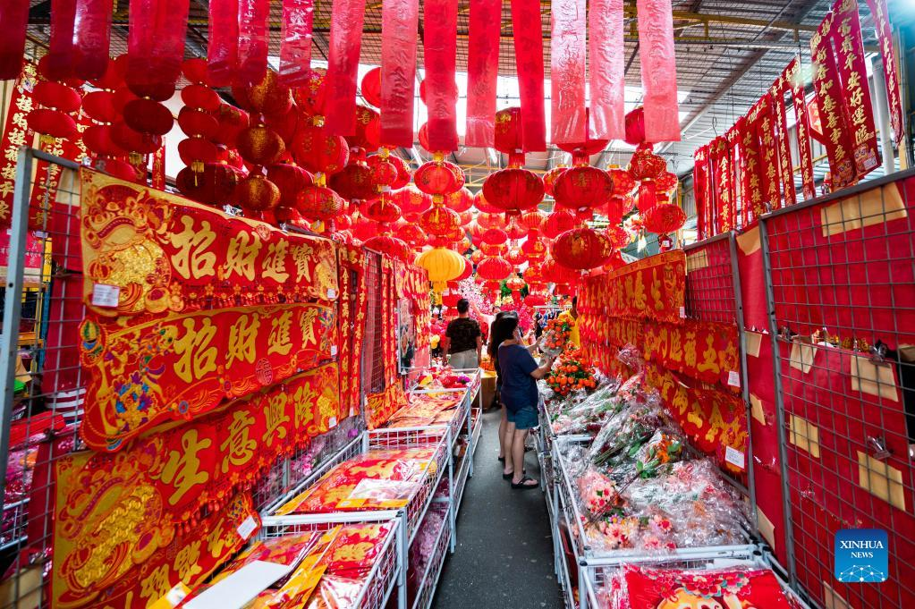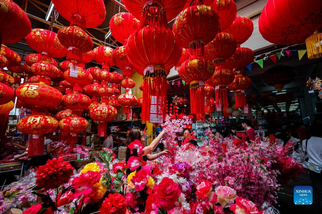 People buy decorations for Chinese New Year at a store in Kuala Lumpur, Malaysia, Jan. 23, 2022. People decorate their houses with plants and flowers as well as traditional decorations such as red lanterns and couplets as the Chinese New Year draws closer. (Xinhua/Zhu Wei)