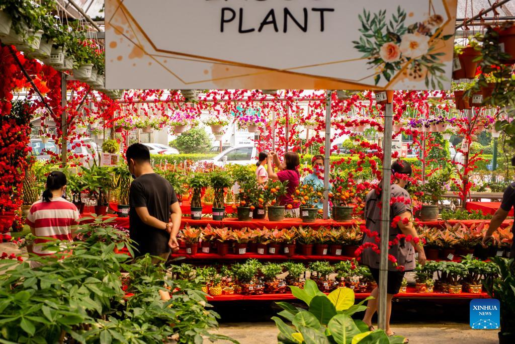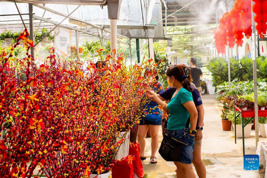 People buy plants for Chinese New Year at a plant shop near Kuala Lumpur, Malaysia, Jan. 23, 2022. People decorate their houses with plants and flowers as well as traditional decorations such as red lanterns and couplets as the Chinese New Year draws closer. (Xinhua/Zhu Wei)