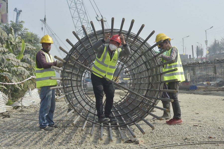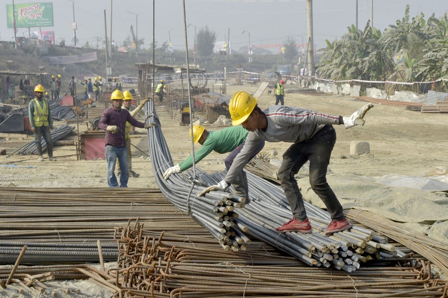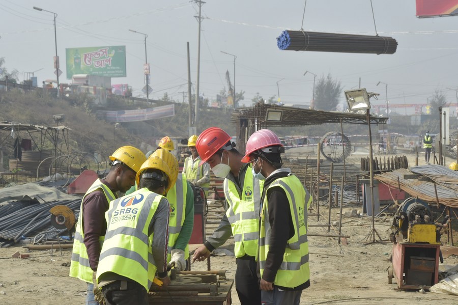 Workers build an expressway which bypasses Dhaka, capital of Bangladesh, Jan. 4, 2022. (Xinhua)