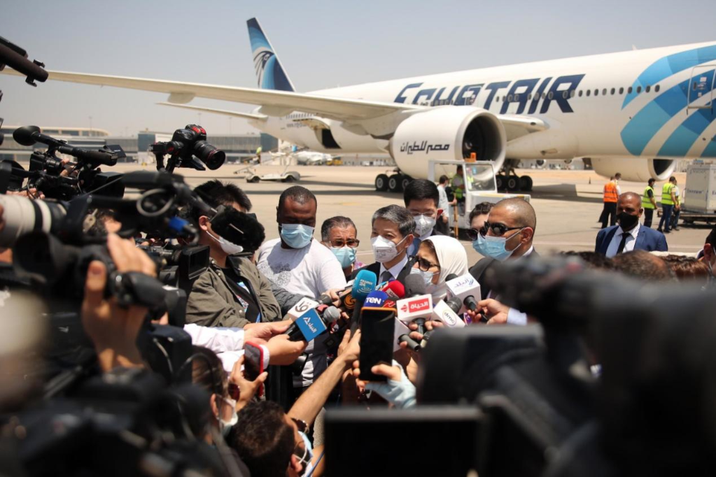 Chinese Ambassador to Egypt Liao Liqiang (3rd R, front) and Egyptian Health Minister Hala Zayed (2nd R, front) meet the media after the arrival of the first batch of Chinese Sinovac vaccine raw materials and a new shipment of China's Sinopharm COVID-19 vaccines at the Cairo International Airport in Cairo, Egypt, May 21, 2021. (Xinhua/Sui Xiankai)