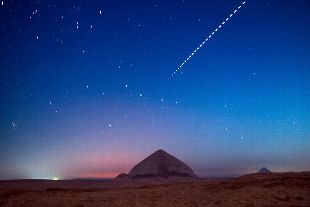 Photomontage taken on Nov. 26, 2021 shows a trail of China's space station over the Bent Pyramid in Giza, Egypt. (Xinhua/Sui Xiankai)