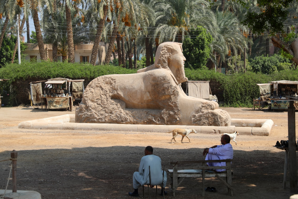Vendors wait for tourists by the statue of Sphinx at the ruins of the ancient Egyptian city of Memphis, around 23 kilometers southwest of Cairo, capital of Egypt, July 28, 2021. (Xinhua/Sui Xiankai)