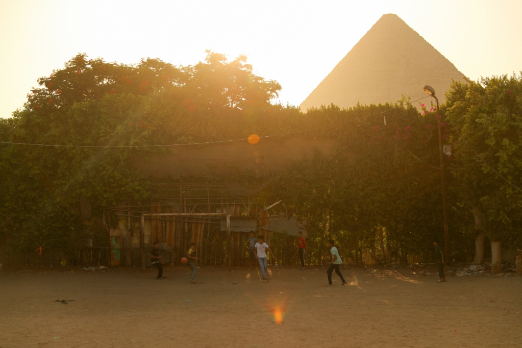Boys play football on the ground outside of the Great Pyramid of Giza, Egypt, on Sept. 19, 2021. (Xinhua/Sui Xiankai)