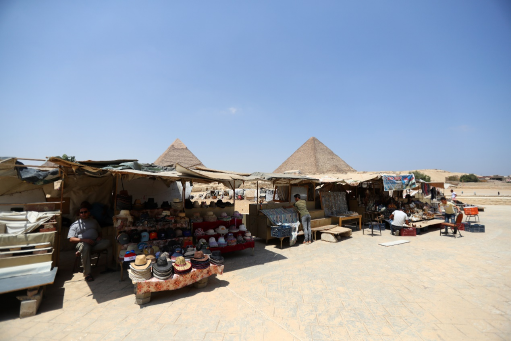 Souvenir vendors wait for tourists at the Giza Pyramids scenic spot in Giza, Egypt, on April 26, 2021. (Xinhua/Sui Xiankai)