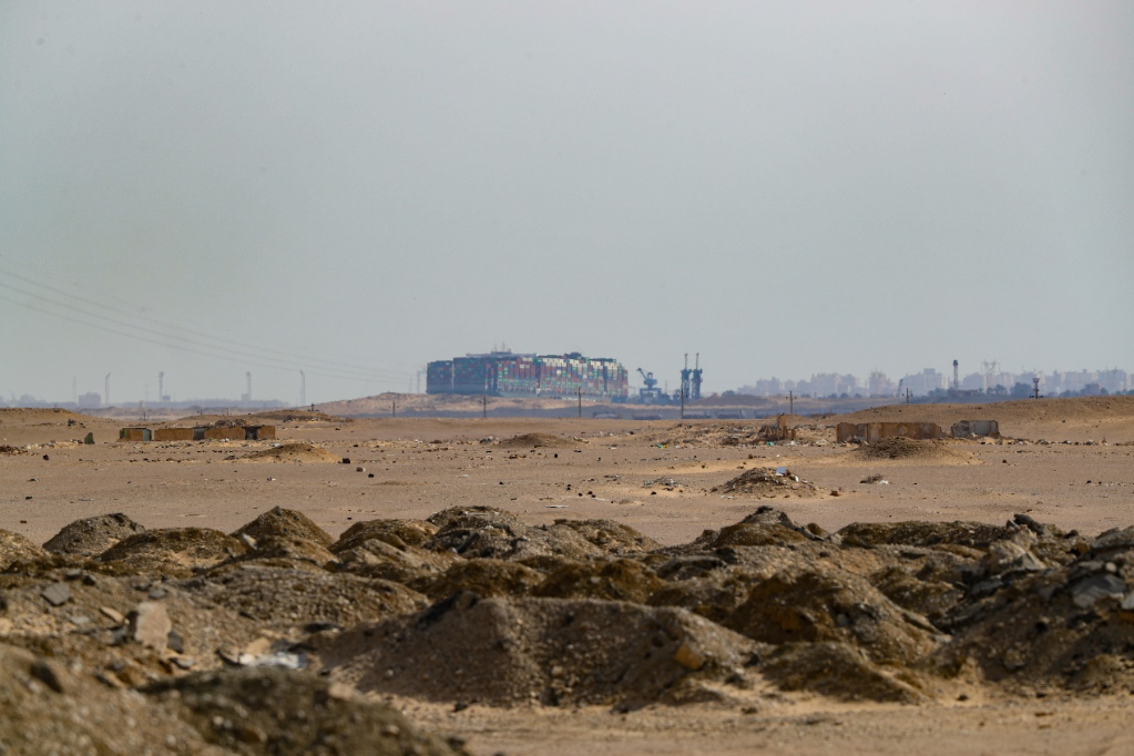 On the morning of March 25, we drove discreetly around the canal, along which military checkpoints dotted, to hunt for the trapped ship. Hours later, we found it but cannot approach it. Given safety reasons, I didn't get off the car, only shooting inside the car at a distance nearest to me. I got first-hand pictures.