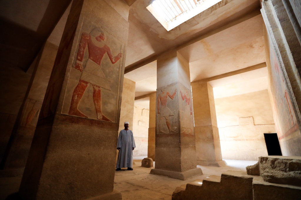 A staff member is on duty in a high official tomb in Saqqara district, south of Cairo, Egypt, Aug. 3, 2021. (Xinhua/Sui Xiankai)