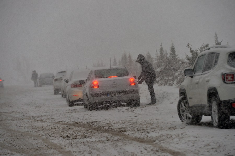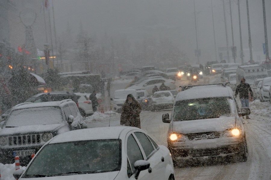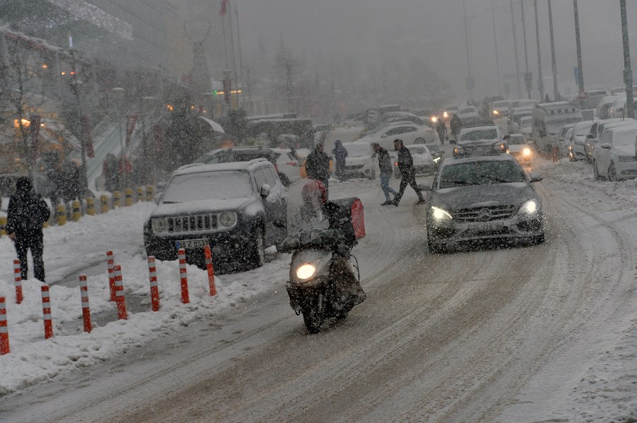 People drive in snowy weather in Ankara, Turkey, on Jan. 22, 2022. (Photo by Mustafa Kaya/Xinhua)