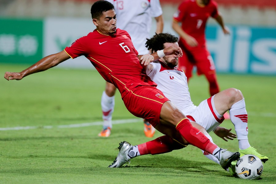 Jiang Guangtai (L) of China competes against Syria in FIFA World Cup Qatar 2022 and AFC Asian Cup China 2023 Preliminary Joint Qualification Round 2 in Sharjah, UAE, June 15, 2021. (Xinhua)