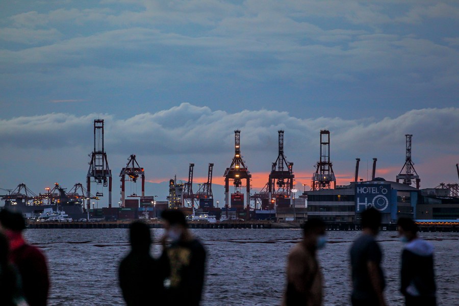 People enjoy the sunset in Manila Bay along the baywalk in Manila, the Philippines on Aug. 31, 2020. (Xinhua/Rouelle Umali)