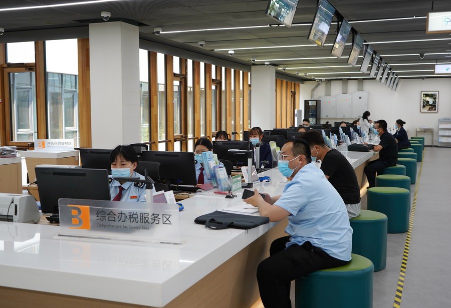 Staff members provide service for citizens at the comprehensive tax service area of the Xiongan New Area Administrative Service Center in Xiongan New Area, north China's Hebei Province, May 12, 2021. (Xinhua/Jin Haoyuan)