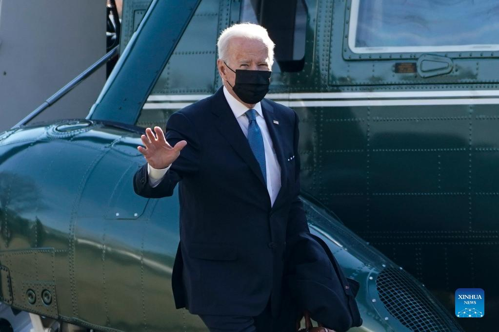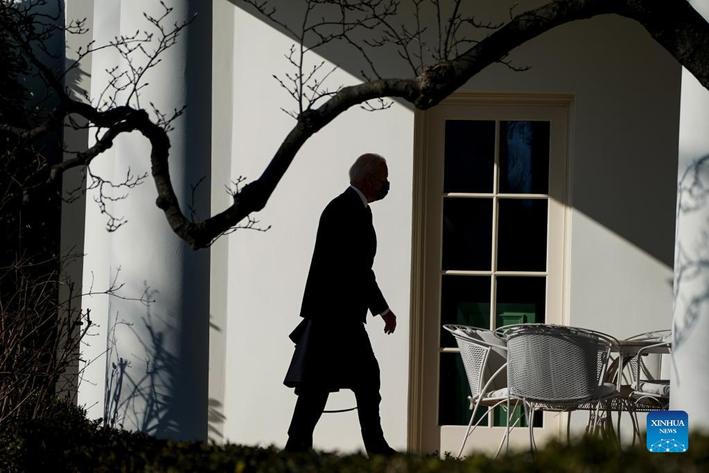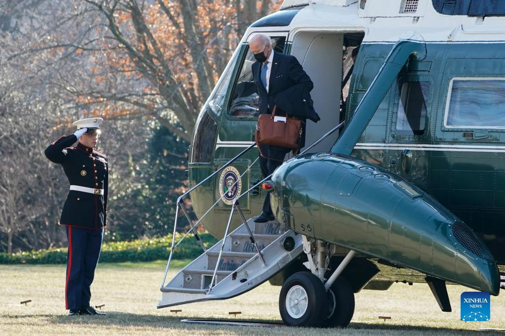 U.S. President Joe Biden arrives at the White House in Washington, D.C., the United States on Jan. 24, 2022. U.S. President Joe Biden reiterated Tuesday that there is no intention in his administration or within the North Atlantic Treaty Organization (NATO) to send troops into Ukraine, but that Russia will face serious economic consequences if it invades the former Soviet republic. (Photo by Ting Shen/Xinhua)