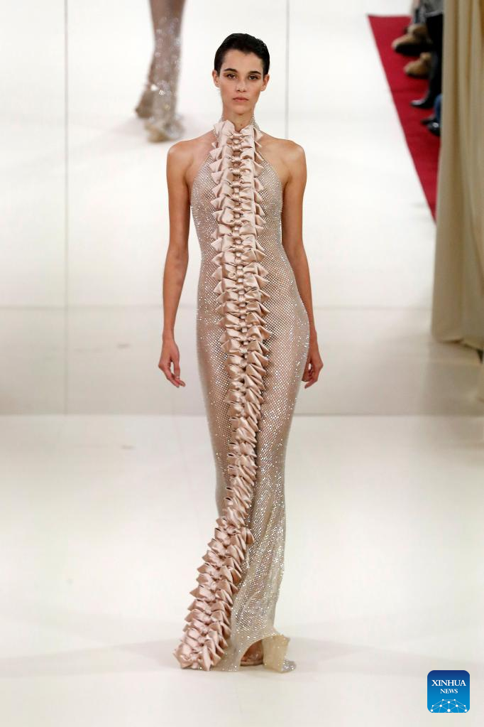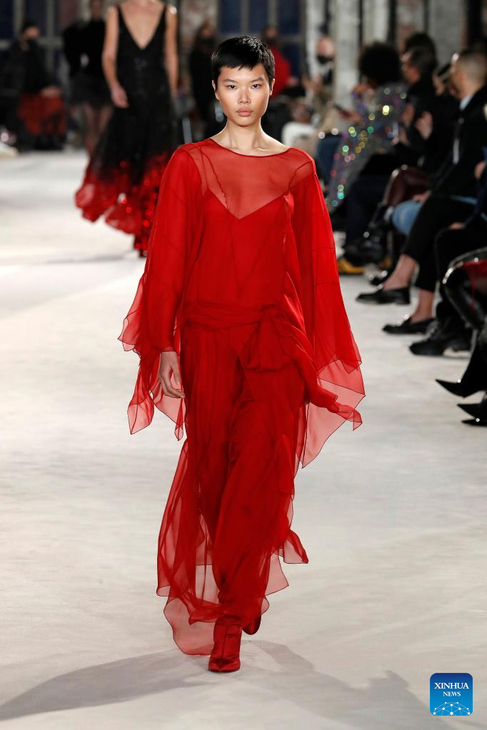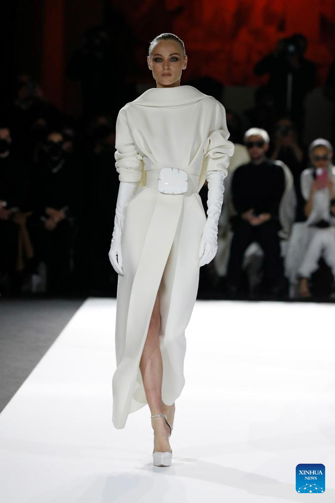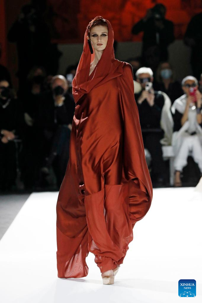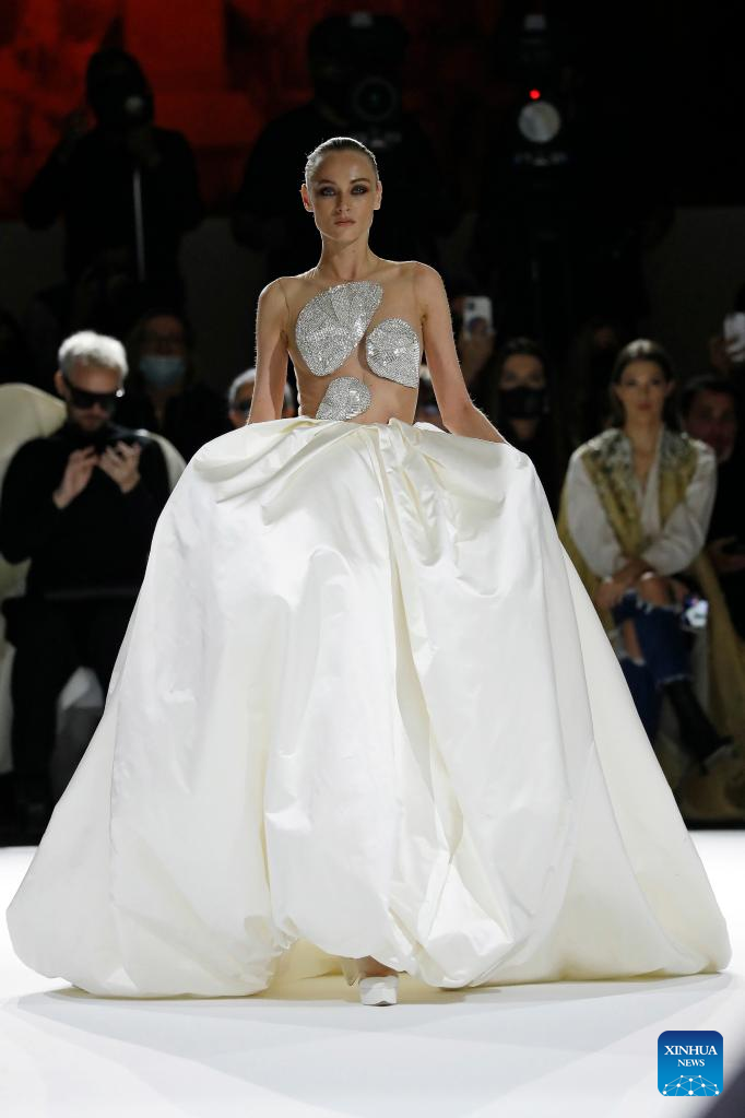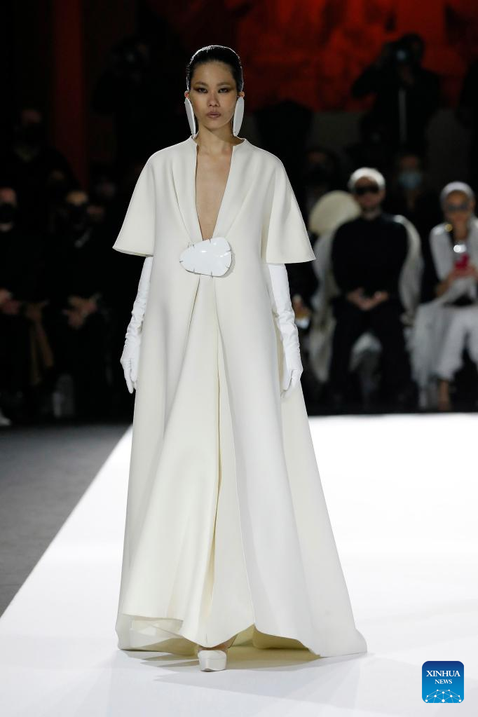 A model presents a creation of Stephane Rolland's Spring/Summer 2022 Haute Couture collections during Paris Fashion Week in Paris, France, Jan. 25, 2022. (Photo by Piero Biasion/Xinhua)