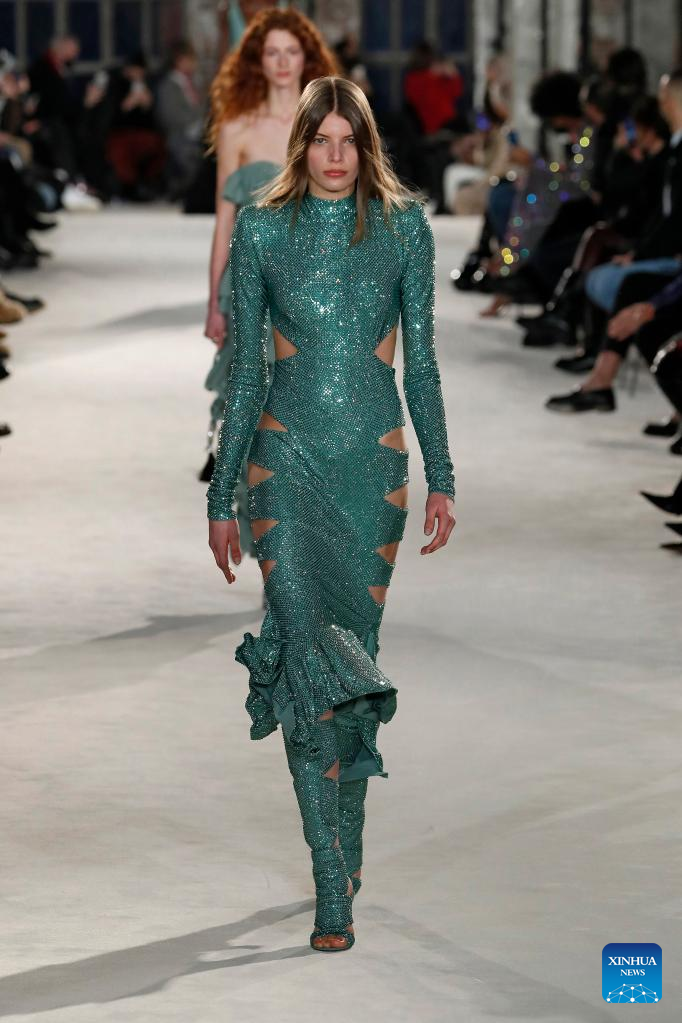 A model presents a creation of Alexandre Vauthier's Spring/Summer 2022 Haute Couture collections during Paris Fashion Week in Paris, France, Jan. 25, 2022. (Photo by Piero Biasion/Xinhua)
