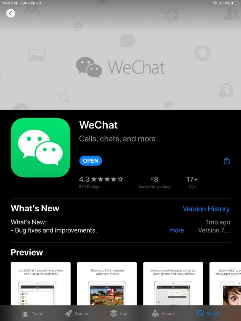 A tablet screenshot taken on Sept. 20, 2020 shows the download page of WeChat, a Chinese messaging, social-media and mobile-payment app, on a U.S. App store. (Xinhua/Wu Xiaoling)
