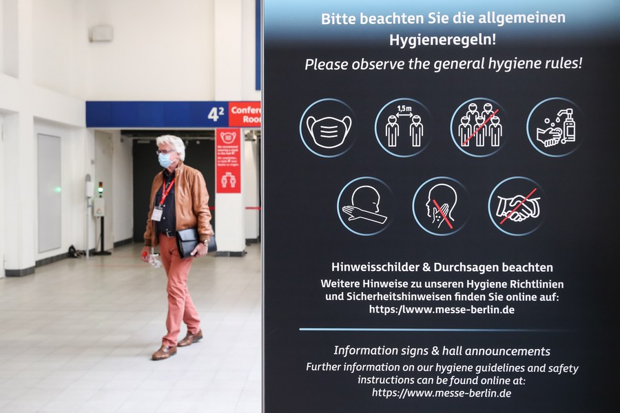 A visitor wearing a face mask walks past a sign of hygiene instructions at an exhibition hall of the 2020 IFA fair in Berlin, capital of Germany, Sept. 3, 2020. The technology trade fair IFA kicked off here on Thursday in a scaled-back format due to the ongoing coronavirus crisis. (Xinhua/Shan Yuqi)■